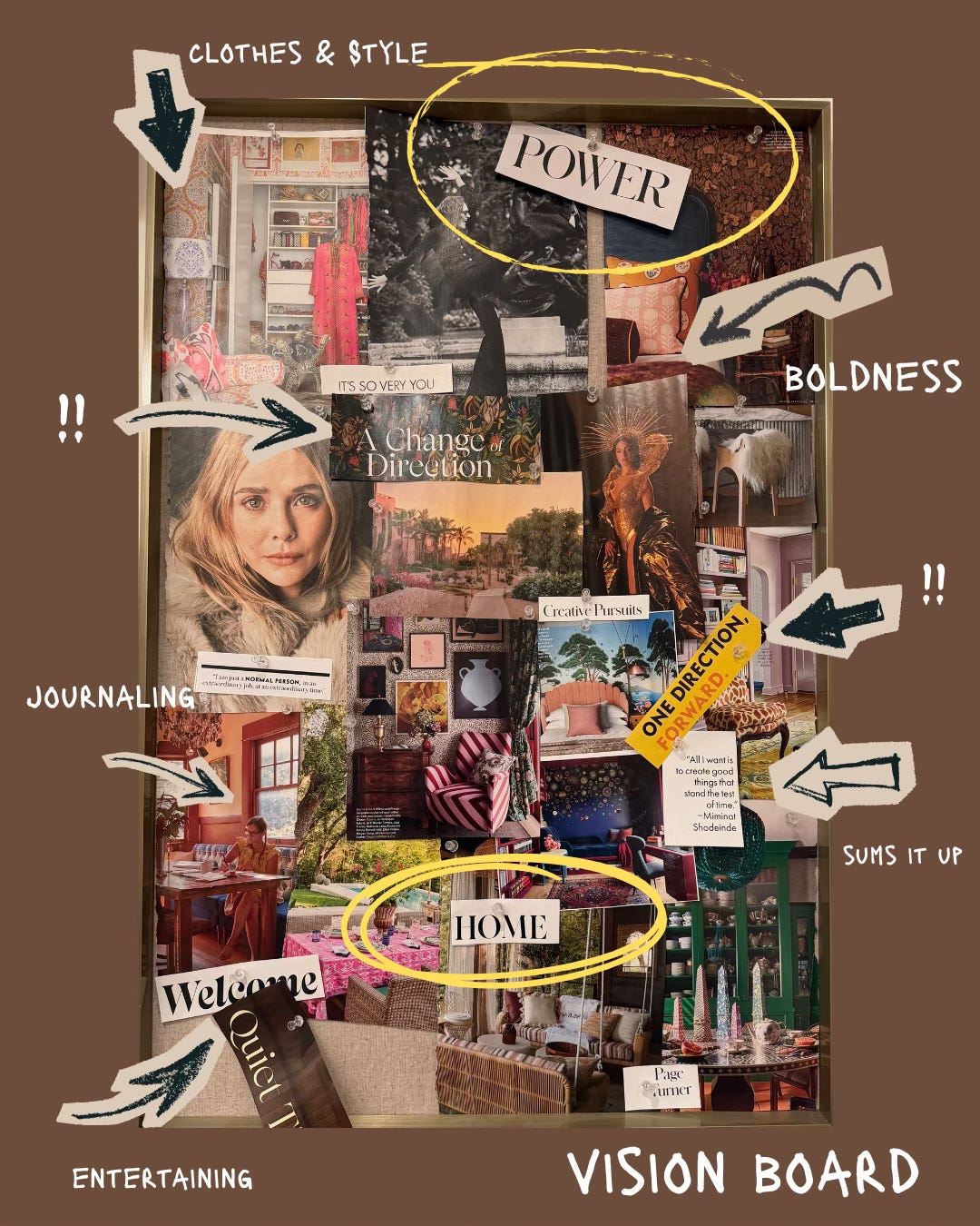 âĄď¸But itâs actually the WORDS that surprise me the most. Welcome and Quiet Time and POWER. These were all things I was craving at the end of last year, after a lot of loudness, discombobulation, and a few scenarios where I felt Iâd given away my own control and autonomy. I cut out two different phrases about changing direction. When I made this board 12 months ago, I didnât know I was going to close the the 10 Things To Tell You podcast or launch Slow Read or make some definitive changes in my personal and social life. Well, it seems some deeper part of me did know, but I wasnât conscious of it.