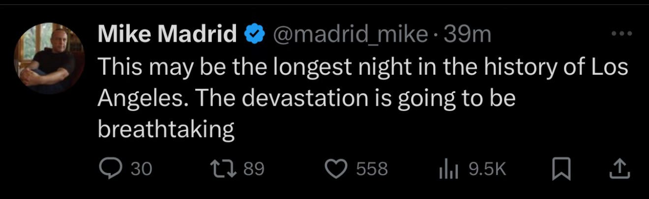 Let me first say that as I type this, I am in my home with my family, safe, with our pets, and not currently in the path of any of the multiple fires burning in the area. That hasn’t been true all week, but it is true right now. And every Angeleno I know has been forced to live in the “right now” every hour since last Tuesday.