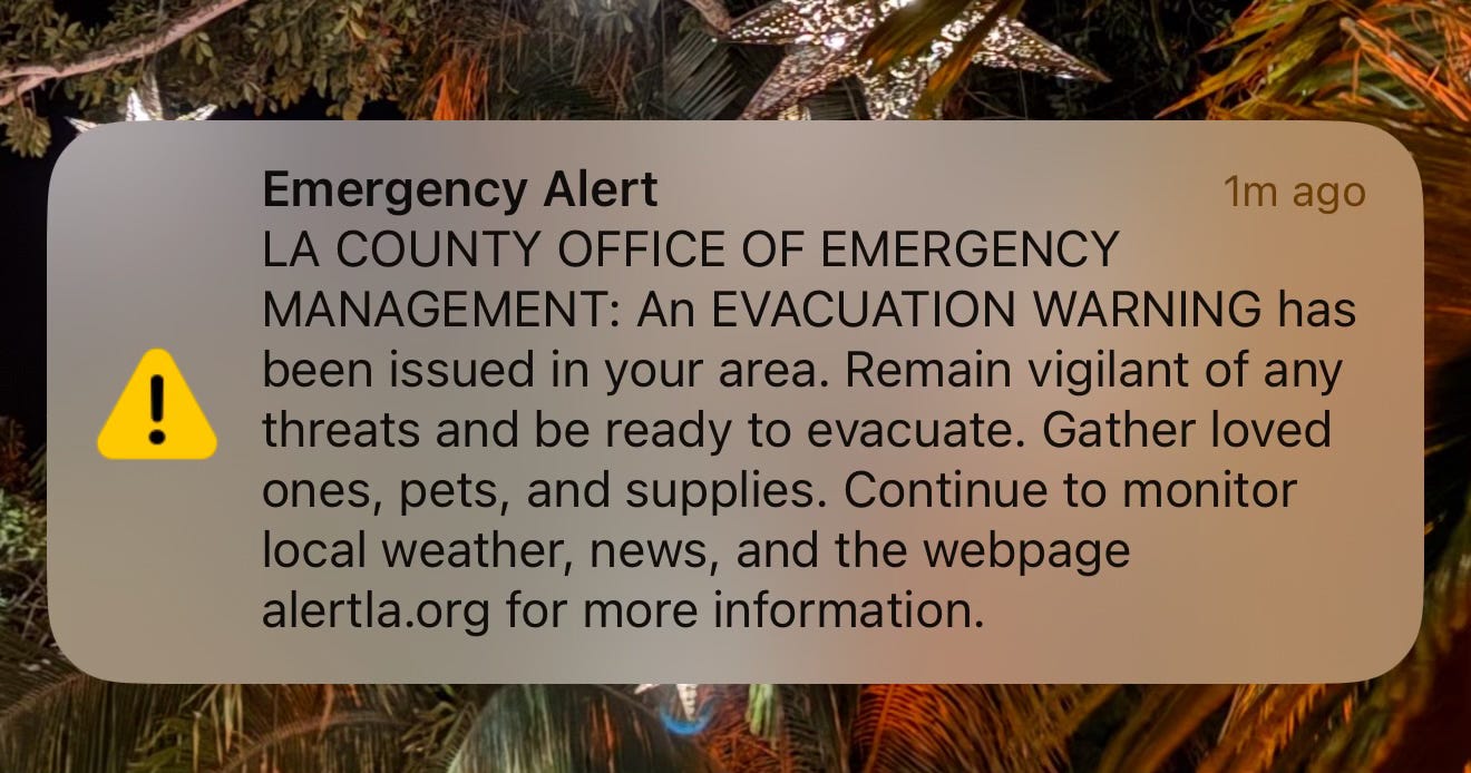 The wind in the middle of the day was nearly 80 mph. People were stopping in the street to take photos of the smoke that kept billowing up by the ocean. Evacuation orders began and so then we were watching live footage of people fleeing their homes in the Palisades, where there was gridlock. People were stopping in the street to abandon their cars and walk to safety. We started asking ourselves, “What would we do if…?”