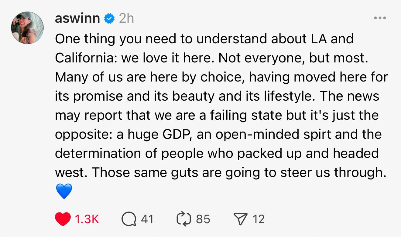 But we are enormously grateful for our safety. We are devastated and heartbroken for those who have lost everything. Every day we learn of more friends who have lost their homes. In the last few days, the landscape of Los Angeles has changed. Physically and emotionally.