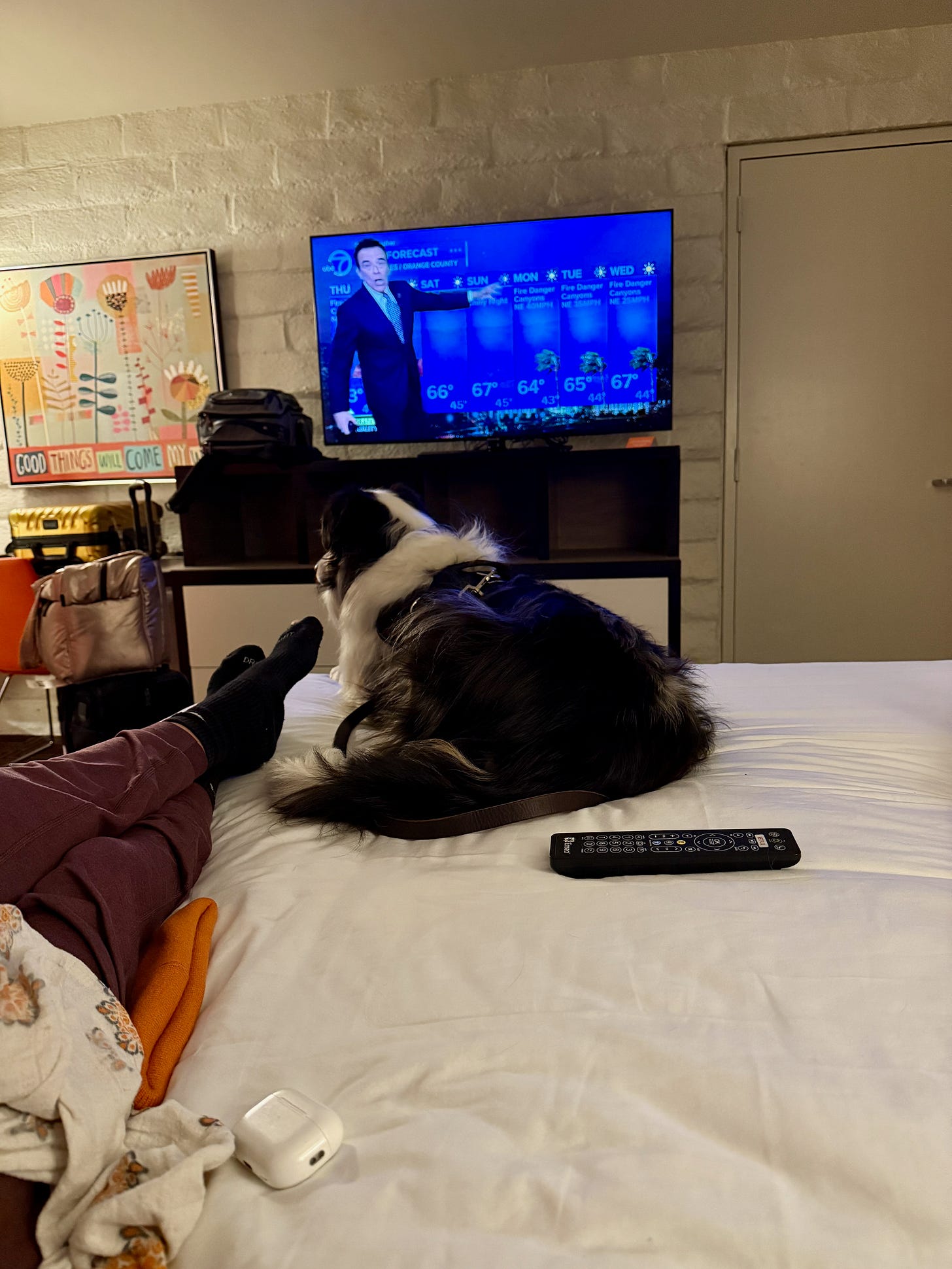 At the hotel, the lobby was full of people evacuating. There were so many pets. It wasn’t chaos, but it was loud. Everyone was kind. The woman at the front desk had to ask me three times how many nights I needed. I just stared at her blankly.
