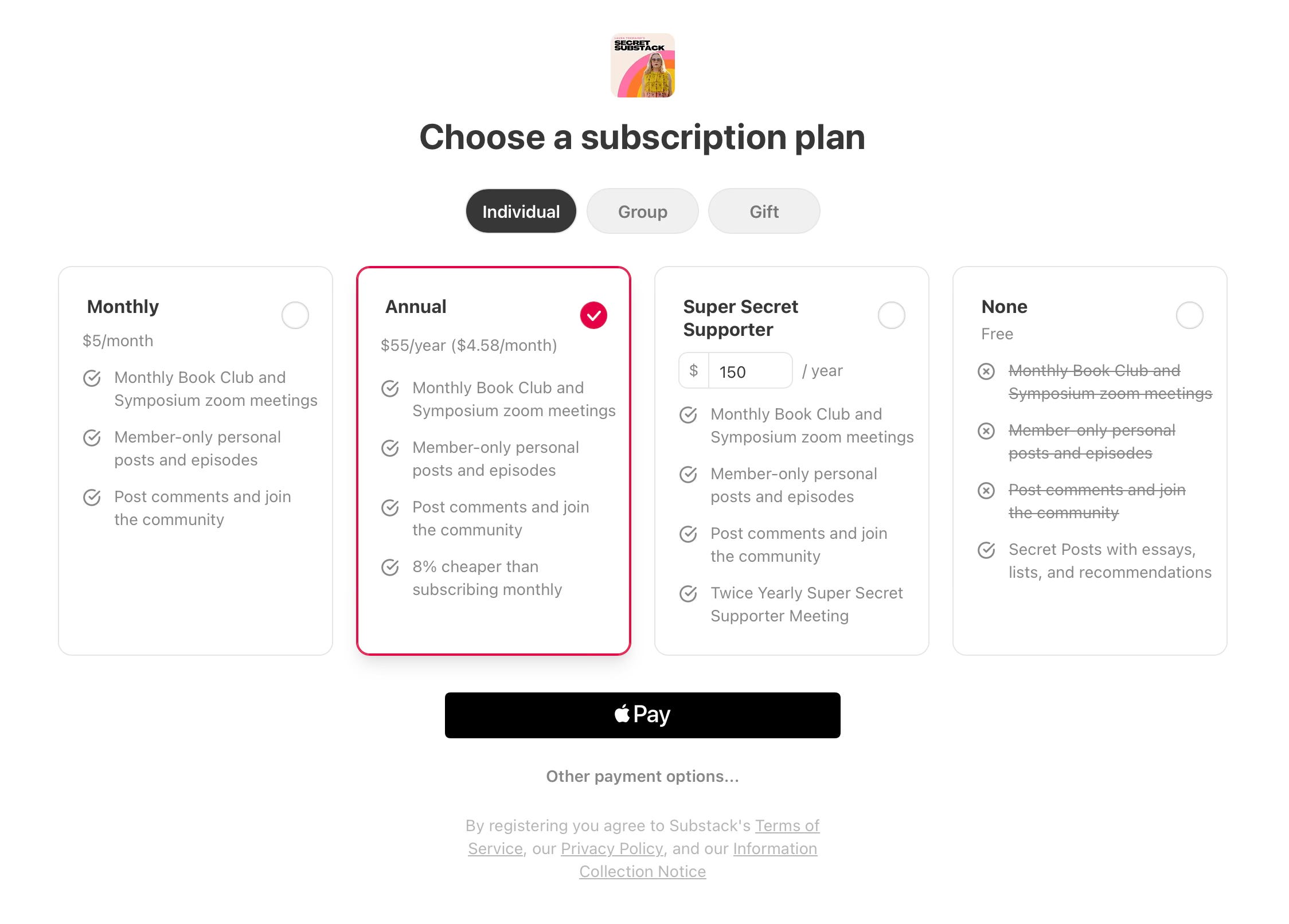 Remember that you can always choose the FREE option on the far right. Different creators offer different versions of what they provide for free or for the paid plans, but on Substack there is always an option to subscribe for free.