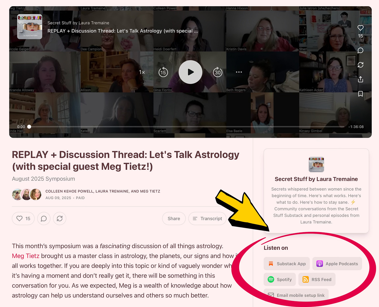 Another easy way to find the buttons that help you add audio content to your podcast app is directly on the Substack post (again, not on mobile). Here’s a screenshot from this Symposium meeting with the audio only replay: