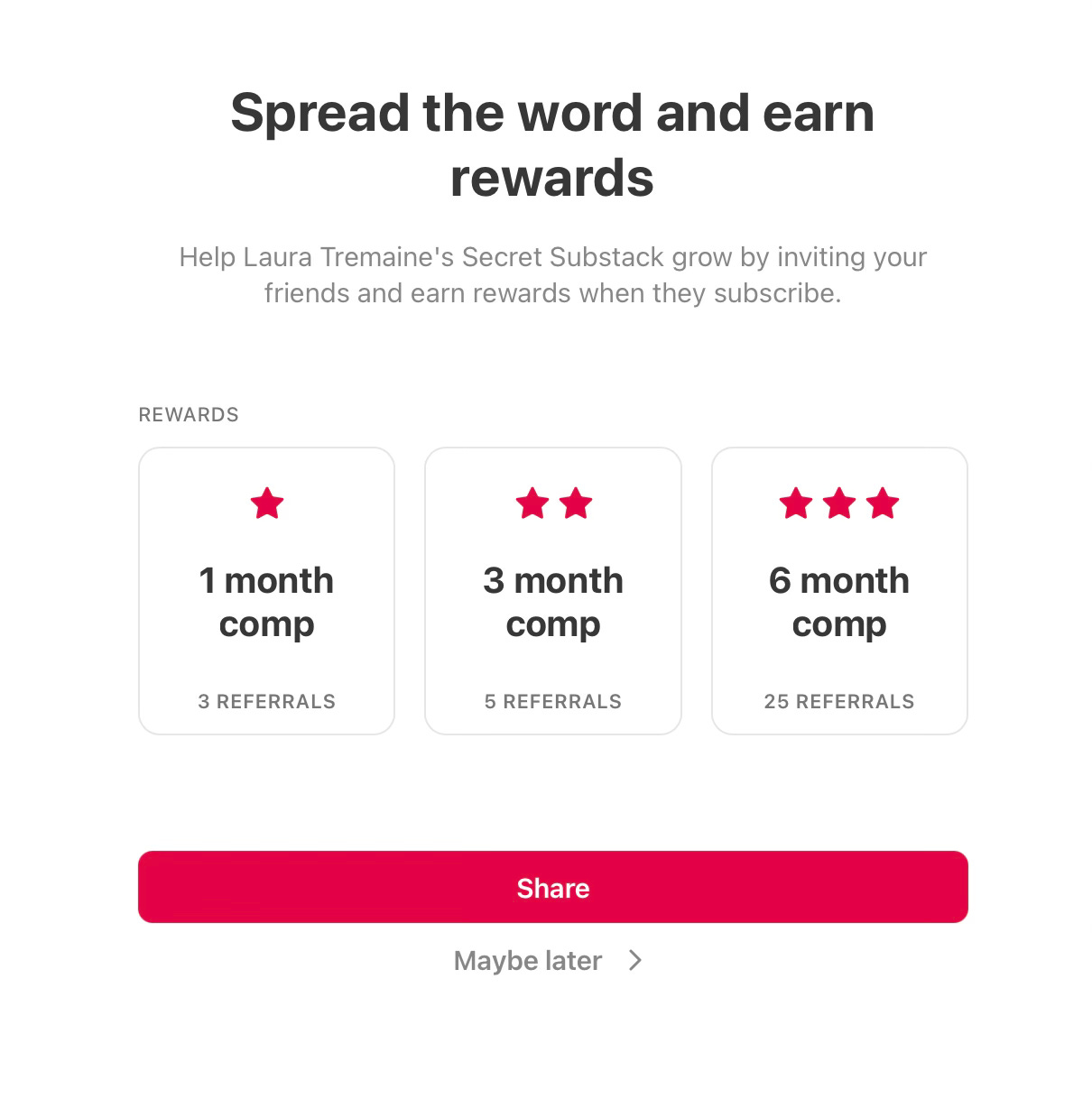 I offer the referral rewards (not all Substack creators do), but you do not have to share anything right at that minute in order to receive your comps. Just click “maybe later” on this page to get to the good stuff.