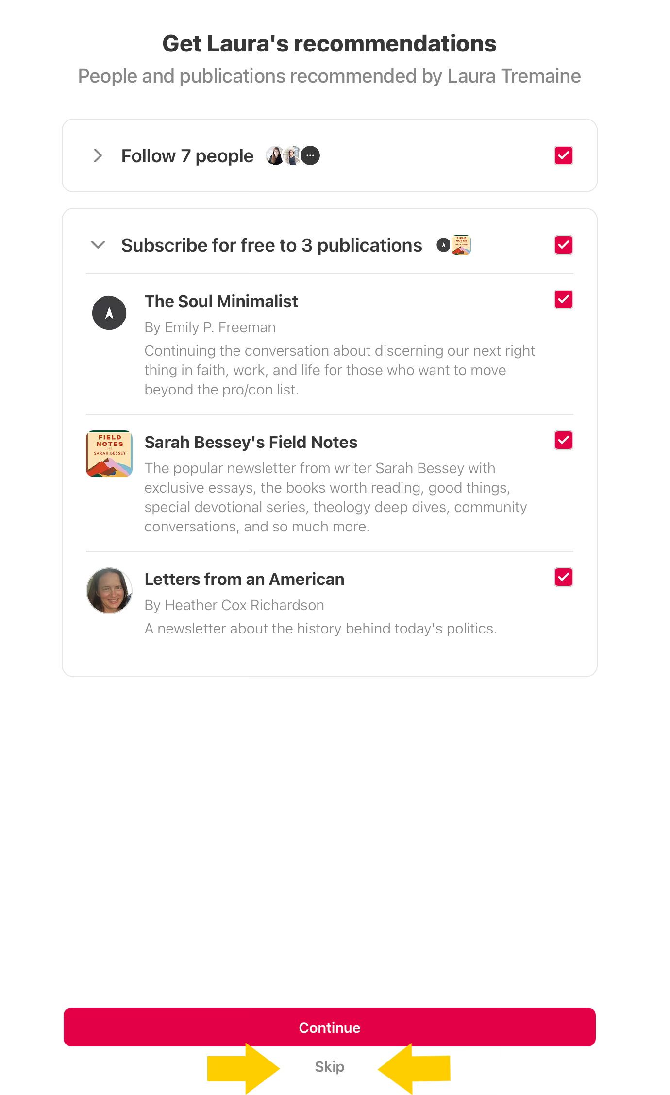 But what you’re doing when you hit “continue” is you’re suddenly following and subscribing to these new people that you never meant to. So you might start getting app notifications or emails from these creators and you’re like “what in the world, Substack?!” because you never meant to sign up for anything else.